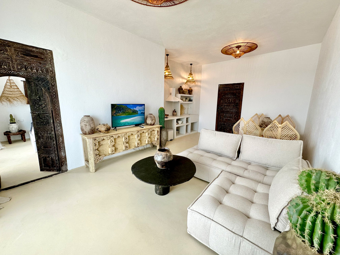 Обширната всекидневна зона с ръчно зидана кухня и уютен хол е сърцето на апартамента – място, създадено за споделени вечери и разговори под звуците на морето.